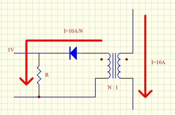 假定用電流互感器檢測變換器的原邊電流,原邊10A電流對應1V電壓。當然,咱們能夠用一個1V/10A=100mΩ的電阻來檢測,可是電阻將構成的損耗為1V×10A=10W,這么大的損耗對幾乎一切的規劃來說都是不能承受的。所以,要選用電流互感器,如圖1所示。